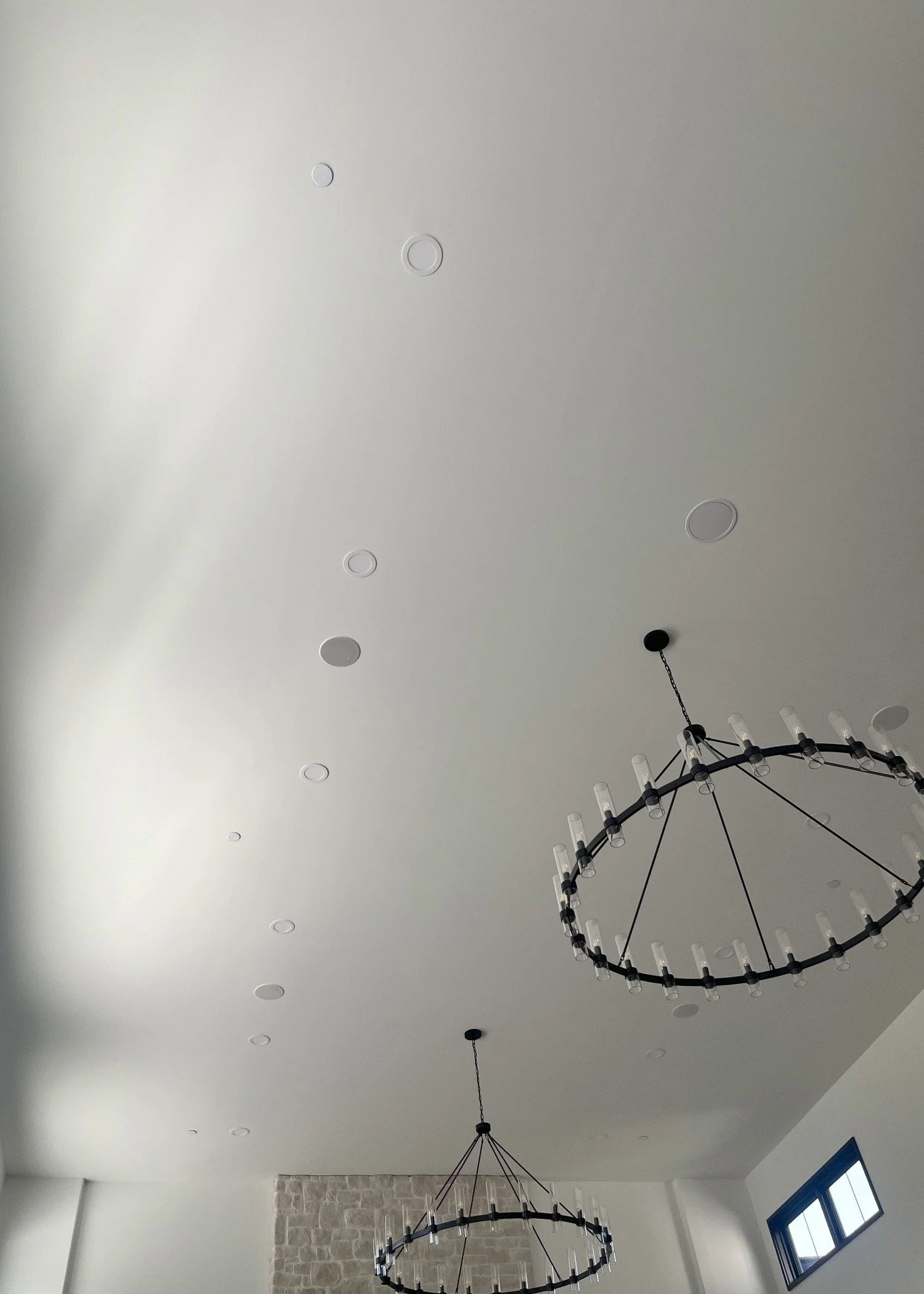 In-ceiling speakers and a discreet wireless access point deliver seamless coverage — even in a space with 20-foot ceilings. Every speaker was positioned with precision to optimize audio delivery and each access point was placed to avoid performance drop-zones, part of a whole-home plan that balances audio clarity and strong Wi-Fi in every room.